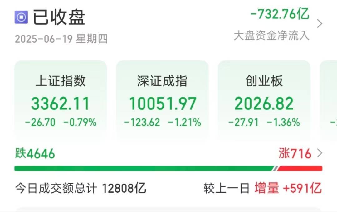 【大河财立方消息】6月19日,A股三大指数午后持续走弱,截至收盘,沪指跌0.79%,深证成指跌1.21%,创业板指跌1.36%,全天成交额1.28万亿元在线股票配资网,较上一个交易日增量591亿元。
